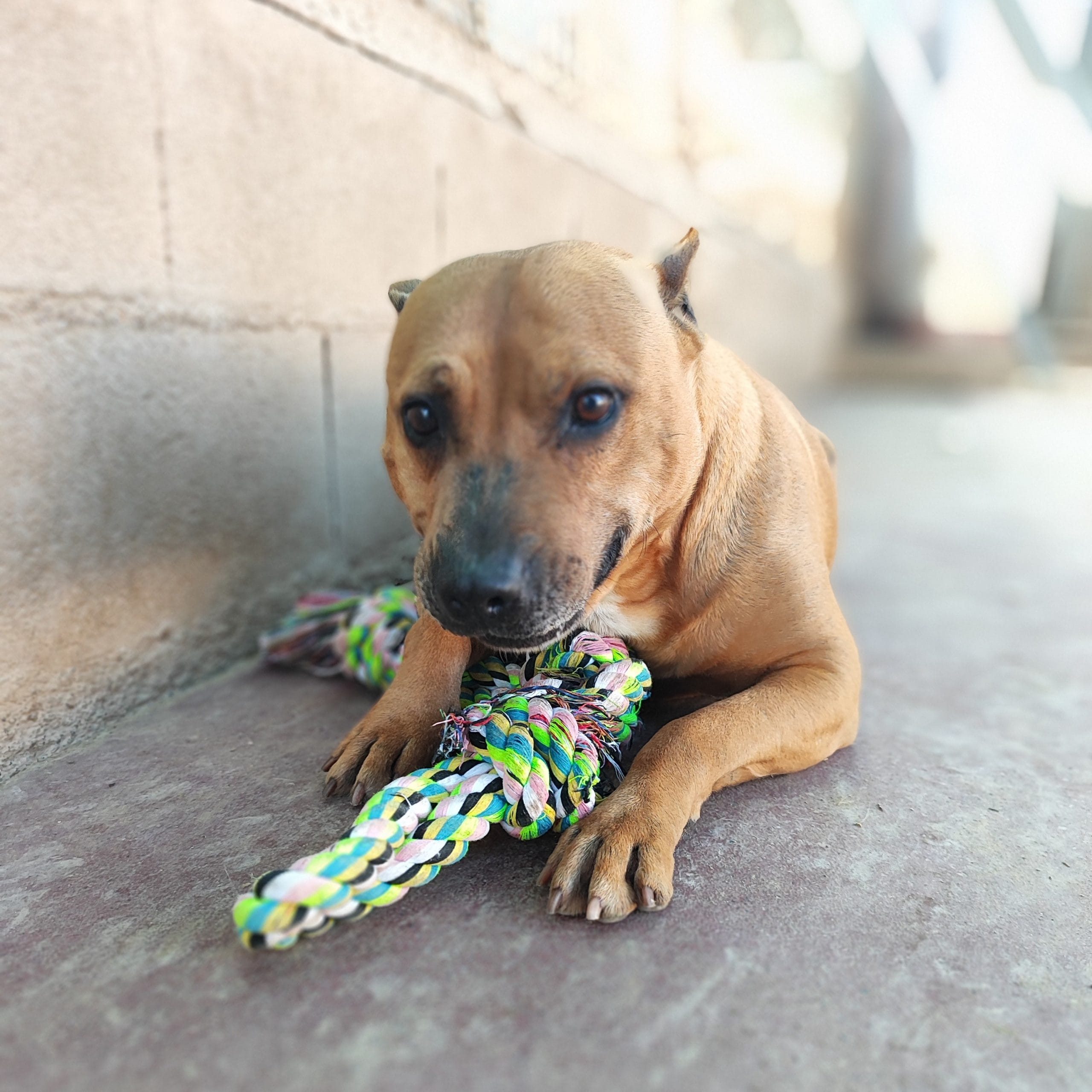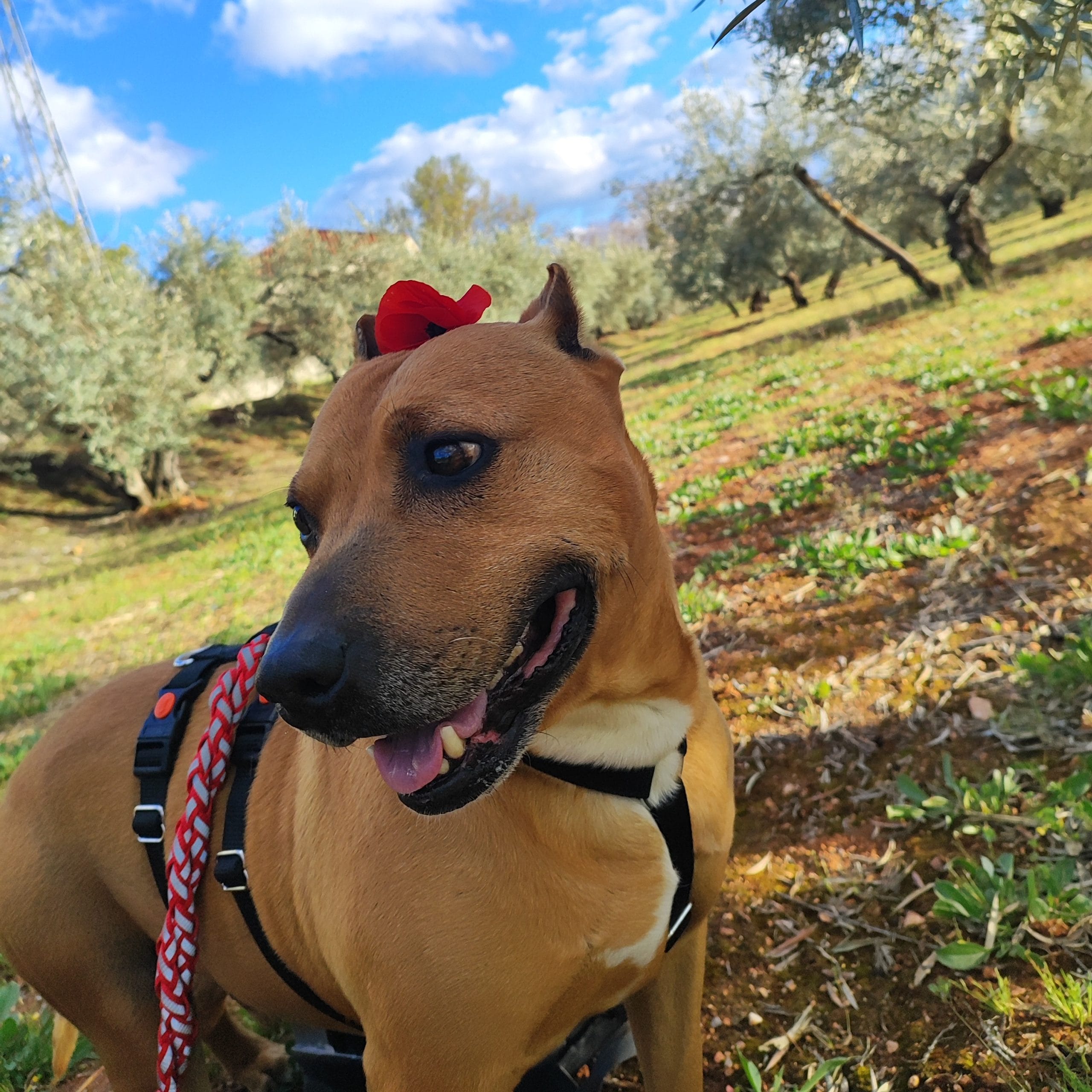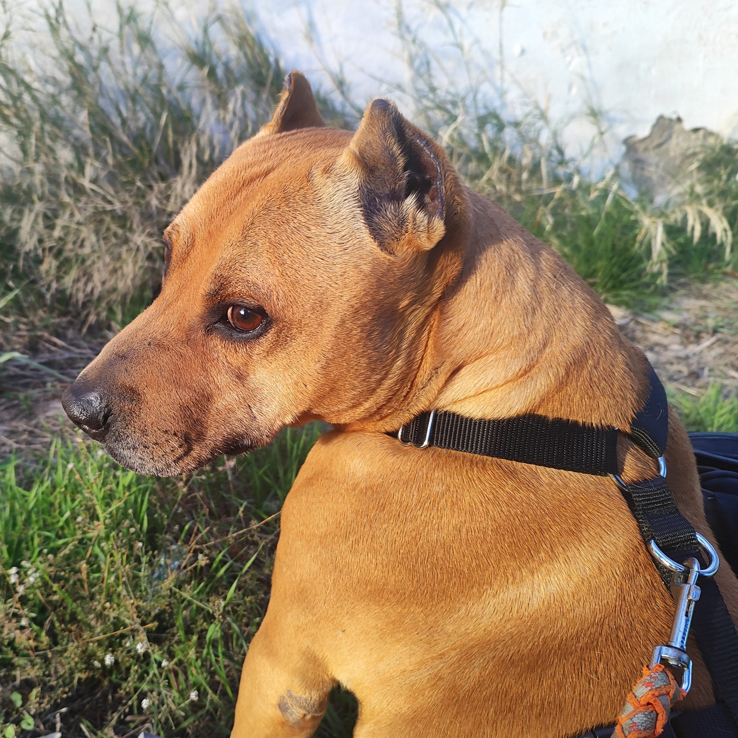 Boop es un perro mestizo tipo Staffordshire Bull Terrier de aproximadamente 10 años, que lleva gran parte de su vida esperando una oportunidad en el refugio. Es un perro muy cariñoso, juguetón y con un carácter noble, ideal para quienes buscan un compañero leal dentro de una adopción responsable en España.