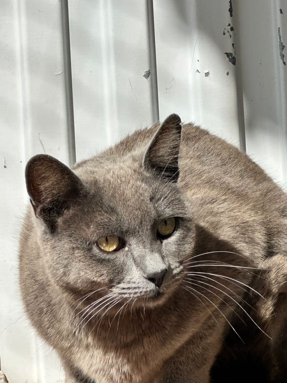 Le encanta pasar tiempo en el patio del refugio y disfrutar del aire libre de manera protegida. En su hogar ideal, Gray podría vivir como gata única o con gatos tranquilos que respeten su espacio.