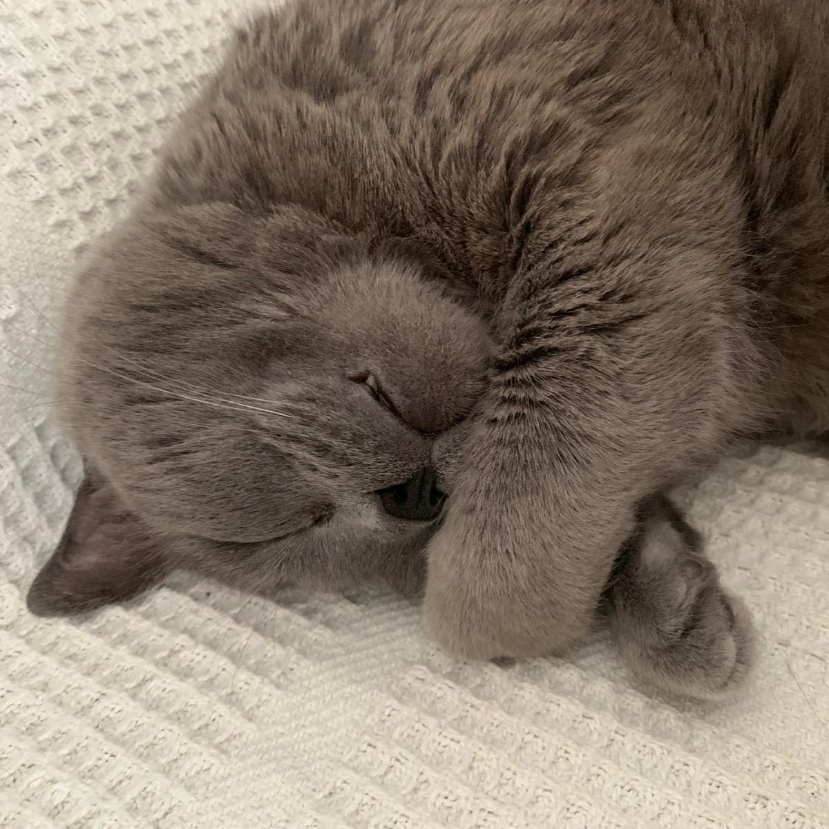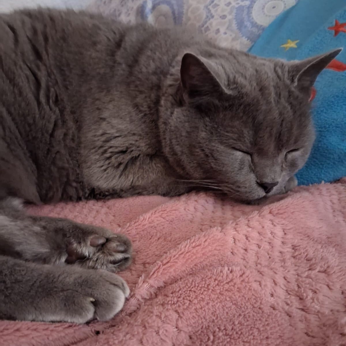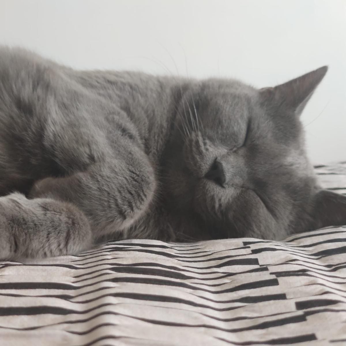 Humo es un gato muy tranquilo, duerme gran parte del día y suele activarse más por la noche, aunque si durante el día recibe estímulos y juego, también descansa por la noche sin problema.