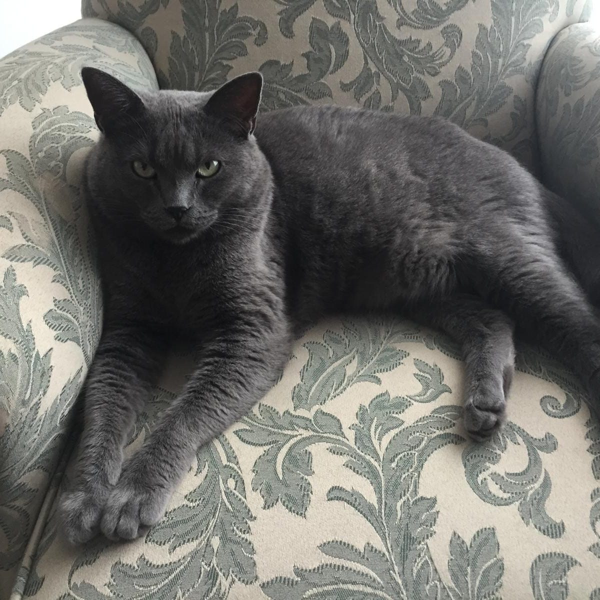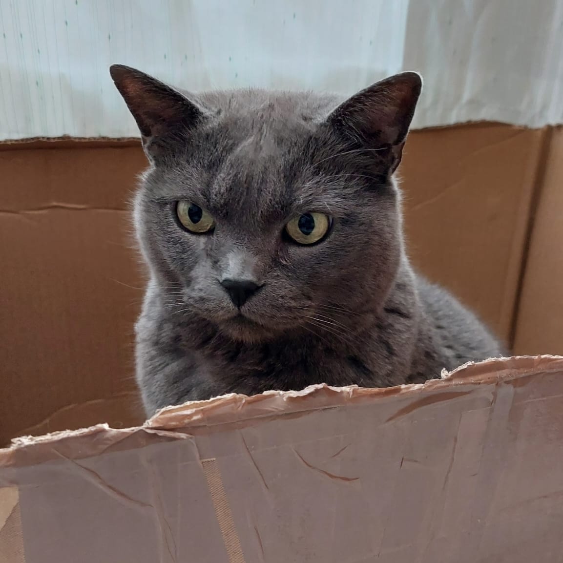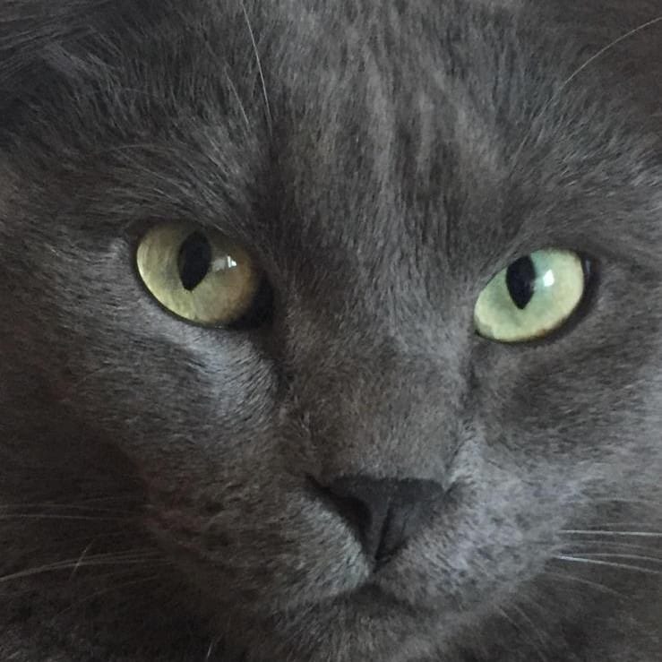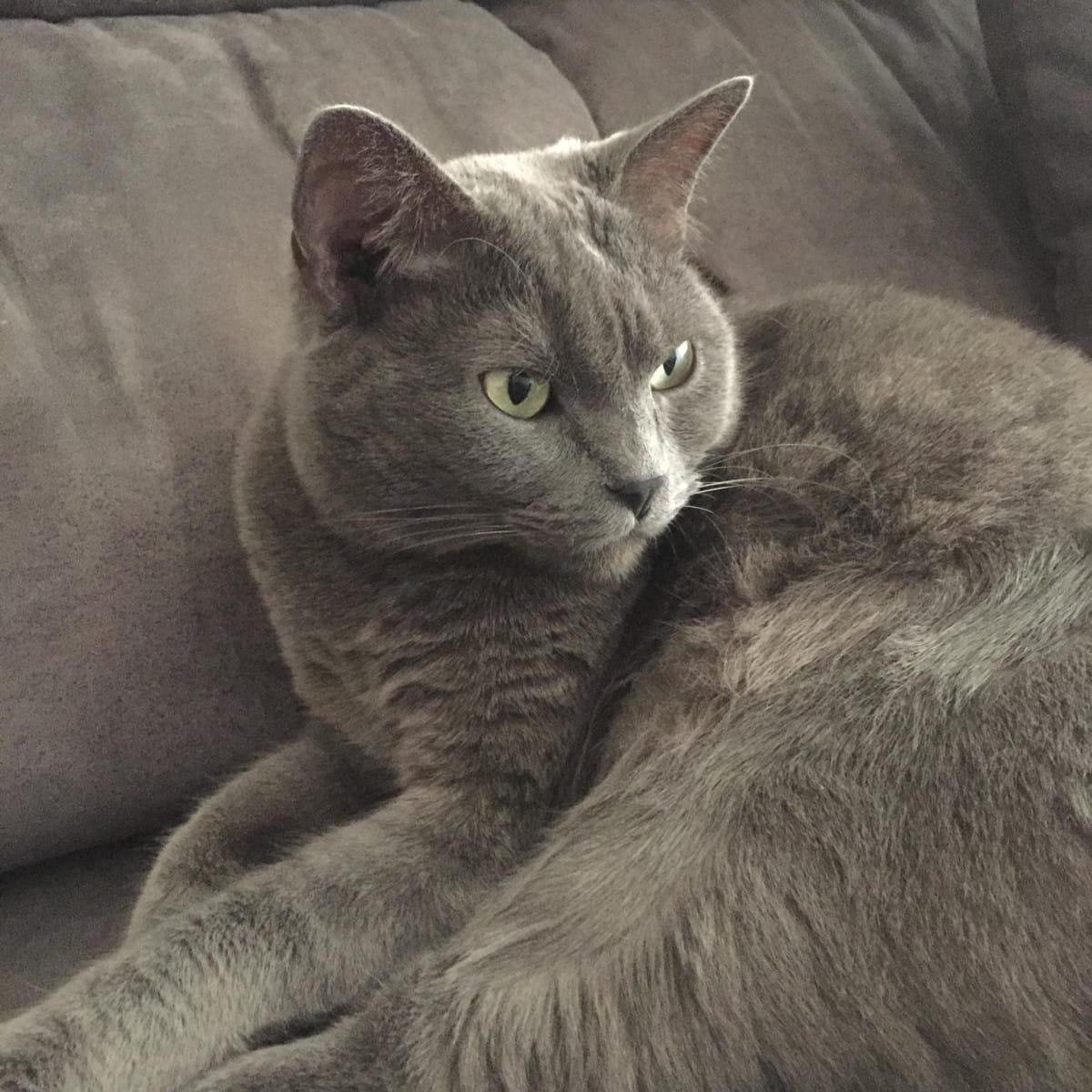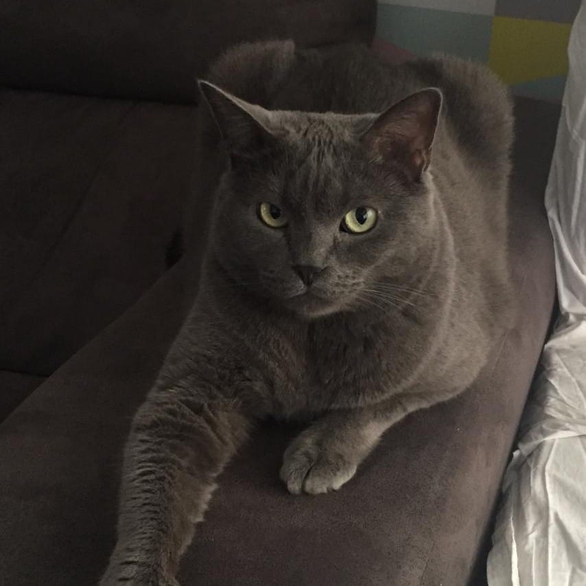 De pelo corto y color gris, Humo es un gato adulto mayor de energía baja, ideal para hogares tranquilos que busquen un compañero sereno y con carácter definido.