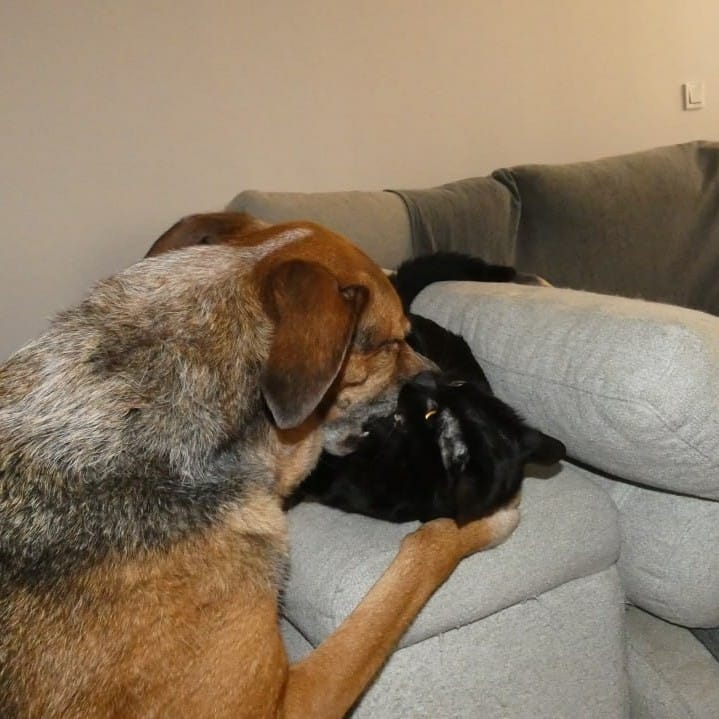 Con perros se lleva genial: comparte espacios sin problema e incluso duerme junto a ellos. Sin embargo, con otros gatos la relación es más complicada, por lo que debería ser gato único en casa. Con niños no ha sido testado directamente, pero por su carácter sociable e interesado en las personas, se intuye que podría adaptarse bien.