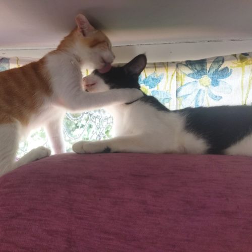 Estos dos gatos son increíblemente sociables, se llevan bien con personas, gatos y perros. En su casa de acogida conviven sin problemas con otros gatos y un perro pastor alemán. Son tranquilos, cariñosos y siempre buscan la cercanía de sus cuidadores, adorando las caricias y los ronroneos constantes. Además, son muy buenos en el veterinario y el transporte.