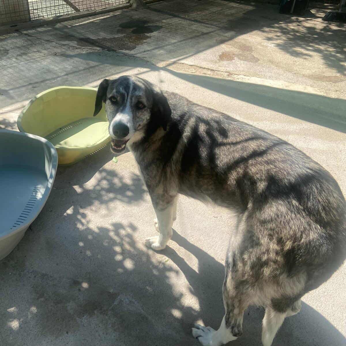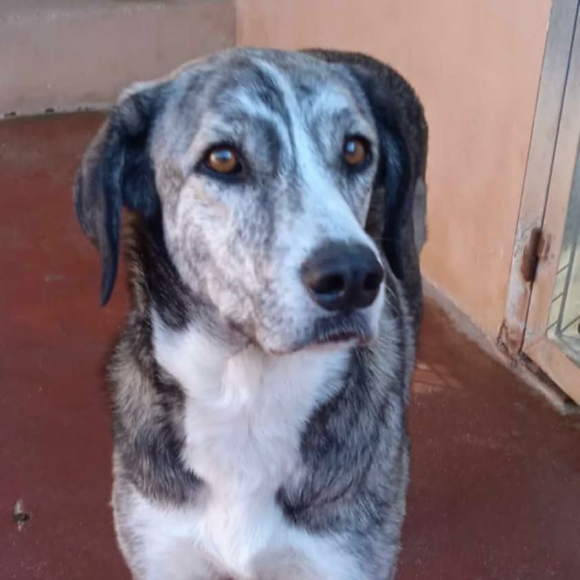 Vesta llegó al refugio tras ser encontrada completamente sola en medio de la nada junto a otra perra. Ambas estaban extremadamente delgadas, llenas de parásitos y sin identificación, lo que evidenciaba una situación prolongada de abandono.